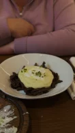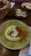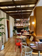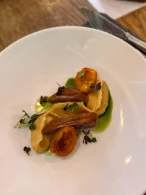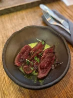 С подругой решили пообедать, зайдя в ресторан, нас встретили очень добродушно. Долго думая, что заказать, мы выбрали блюда, сделали заказ, но потом случайно в интернете я узнала, что проходит РРФ, но официантка почему-то не рассказала и не предложила нам попробовать сет. Доп. меню РРФ к основному меню тоже не было! Естественно мы отказались от блюд и заказали сет. Скажу сразу на сет мы потратили очень много времени, четыре блюда несли около 2 часов. Это слишком долго! Нам налили воды и мы закали хлеб с маслом - хлеб по всей видимости самодельный, но я такой не люблю, очень кислый и слишком твердая корочка. Масло взбитое, нежное. Татаки из говядины с айоли из черемши - само мясо было шикарно, но соус солоноватый для меня, вкус черемши вообще не почувствовала. Гратен со сметанным муссом из лосося - интересное блюдо, очень походит на домашнюю картофельную запеканку с лососем (подруге не зашло), мусс очень гармоничен с гратеном, объедения и придав кислинку блюду. Утиная грудка с кремом алиго-мисо и сливой - супер! Официантка сказала, что крем был из артишоков, но во вкусе был четко картофель, очень странный по консистенции, как будто взбили блендером и выделился крахмал. Слива? Честно я думала, что это никтарин. В сочетании с уткой - это бомба. Бенье с кремом из белых грибов - ой держите меня семеро, ради этого десерта хочется возвращаться. У меня были эксперименты с белыми грибами в десертах, но мне никогда это не нравилось, так как белый гриб перебивал все. Но тут … при первом укусе, ты чувствуешь легкой аромат белых грибов и потом он исчезает, и ты наслаждаешься сливочным кремом с бенье.