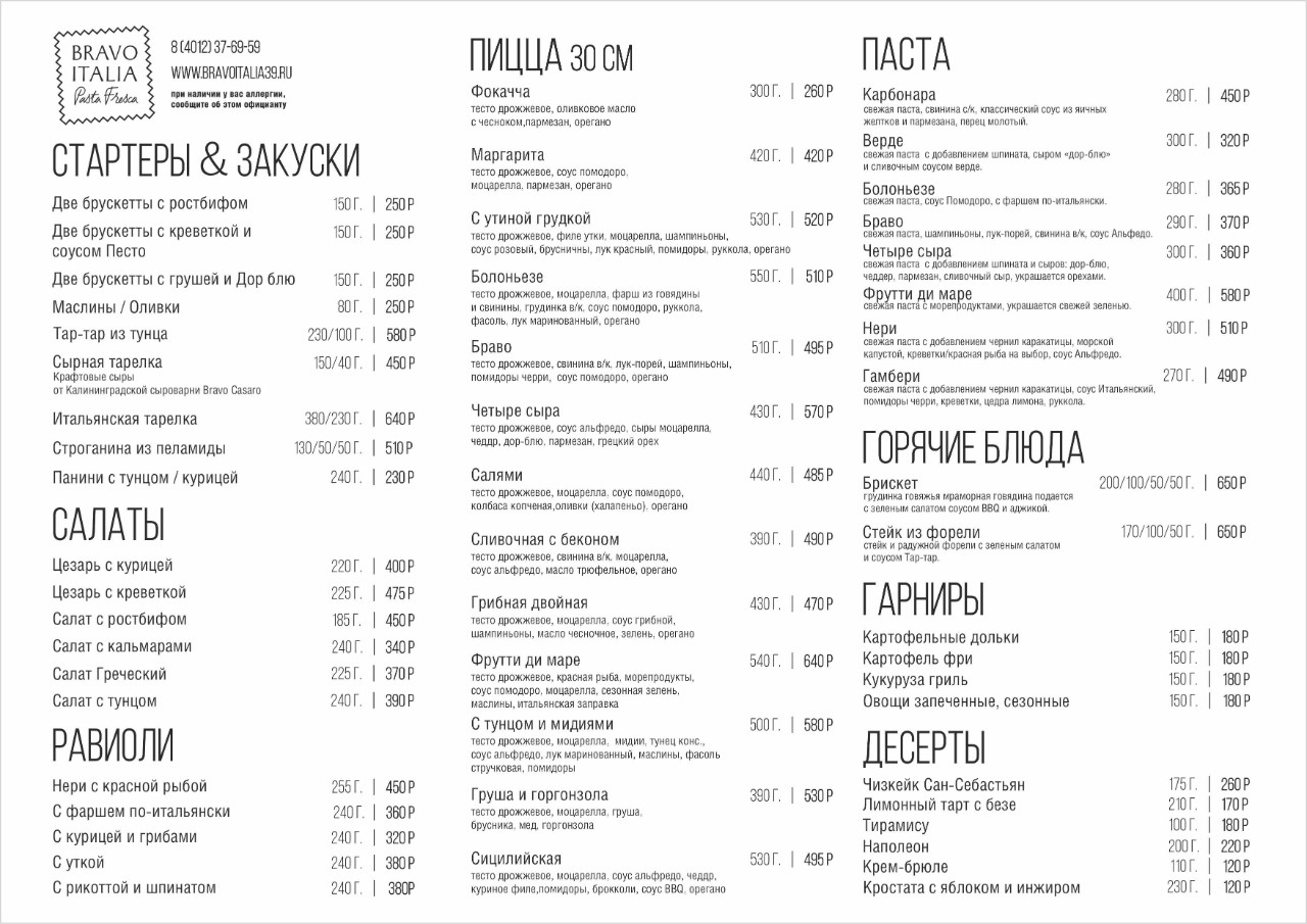 Основу меню составляет итальянская кухня: готовят популярную пасту карбонара и болоньезе, разнообразные пиццы, такие как «Четыре сыра», «Салями» и сливочная с беконом. Закуски включают брускетты с ростбифом или креветками, деликатесный тартар из тунца и строганину из пеламиды. Дополняют список равиоли с уткой и стейк из радужной форели, подаваемый вместе с зеленым салатом.