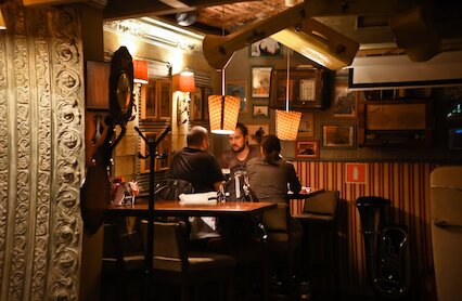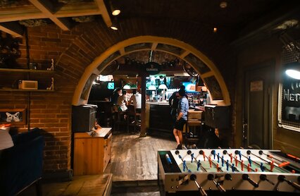 - Винтажный бар с ностальгическим интерьером, кикером и настольными играми