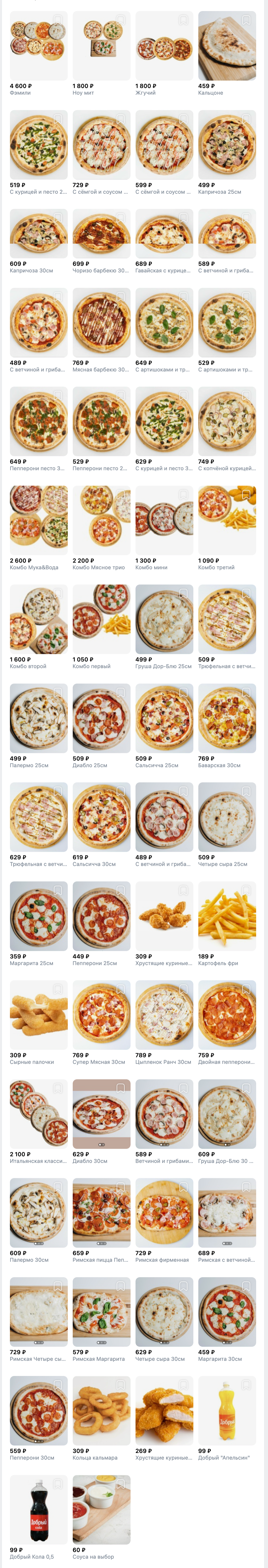 В меню — классические итальянские хиты вроде «Маргариты», «Четырёх сыров» и «Капричозы», а также римские варианты с пышным тестом и авторскими сочетаниями вроде груши с дор-блю или трюфельного соуса. Есть закуски, комбо-сеты и скидки на самовывоз.