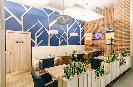 - Симпатичное сетевое кафе с собственной доставкой роллов и пиццы в районе ТРЦ «Мега»