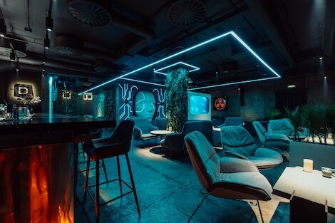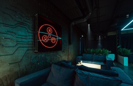 - Футуристический киберспортивный бар с Playstation 5, игровыми автоматами и разнообразным алкоголем