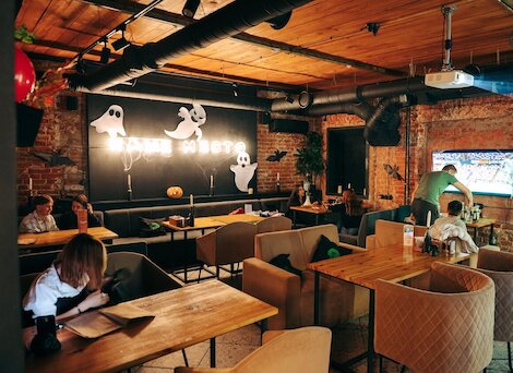 - Атмосферное лаунж-кафе с отдельными кабинками