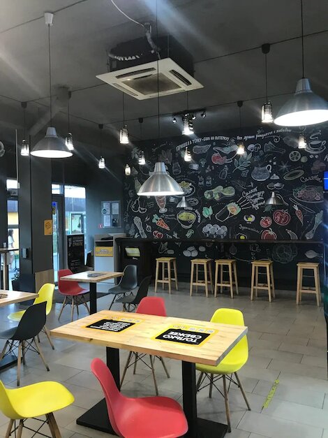 - Минималистичное кафе с собственной доставкой роллов, пиццы и популярного стритфуда
