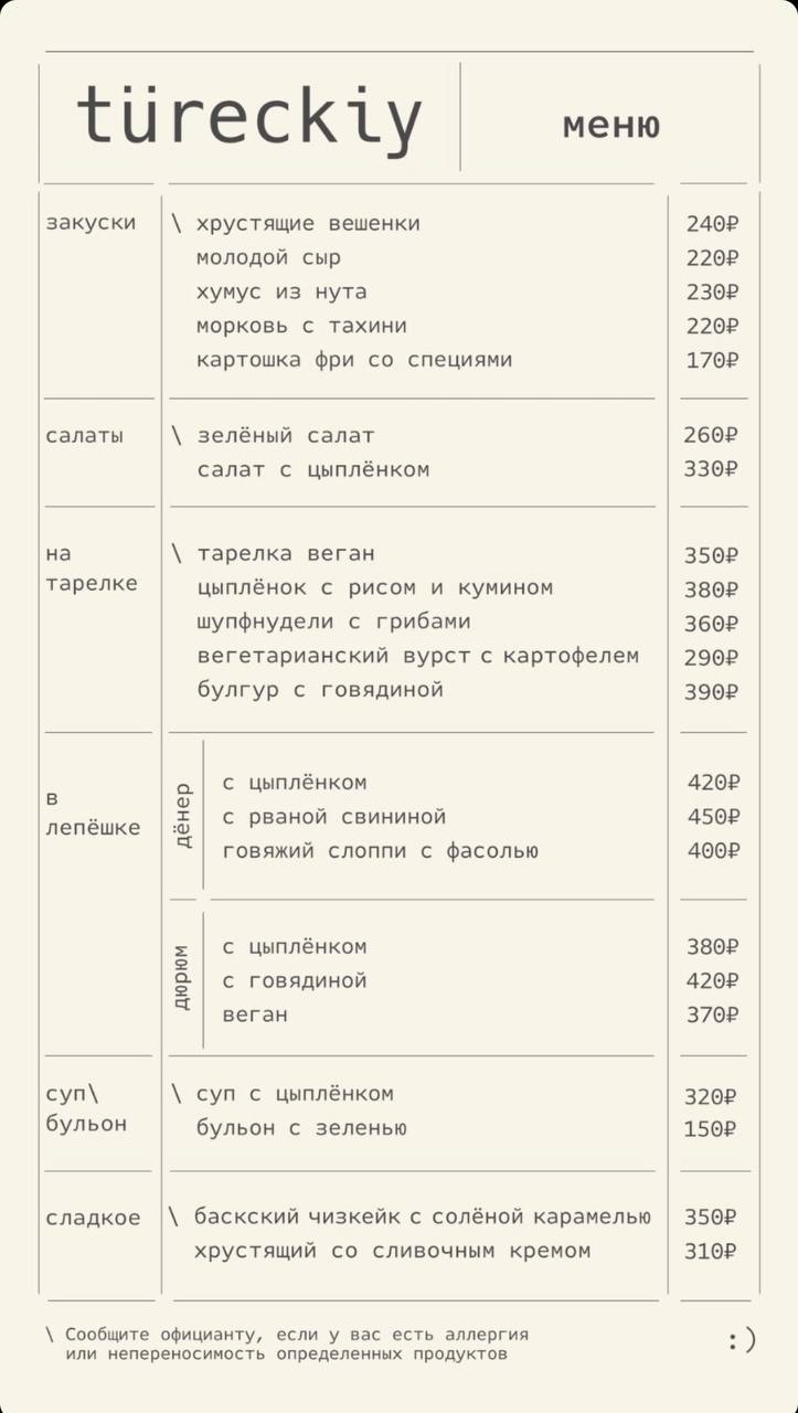 Меню кафе Tureckiy