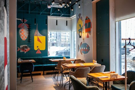 - Красногорск, Красногорский бул. 4, корп. 1Сетевой рыбный ресторан в Красногорске со стильным минималистичным интерьером