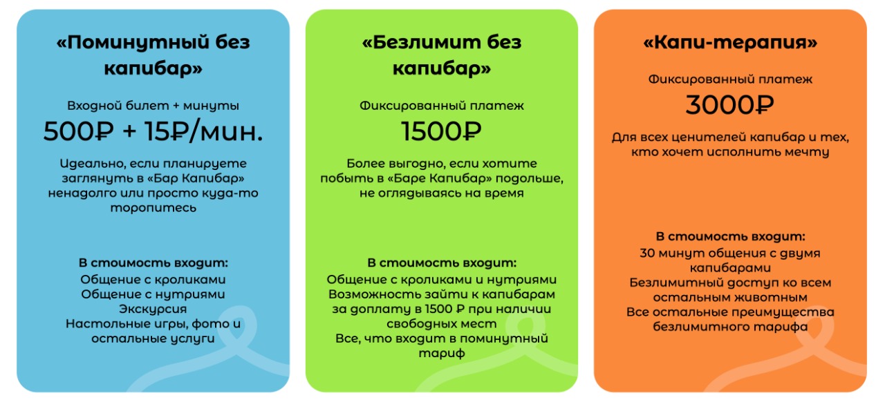 Капибары считаются одними из самых дружелюбных зверей. Вместе с ними здесь живёт банда нутрий и несколько кроличьих семей. Перед встречей с животными обязательно нужно купить билет. Билет приобретается для каждого гостя старше 3 лет. Для детей до 14 лет обязательно сопровождение взрослого. Здесь также можно поиграть в настольные игры и покормить животных с рук.