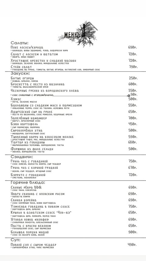 На баре подают разные виды крафта — разливной, бутылочный и баночный. А в небольшом меню собрали популярные блюда разных кухонь мира: битые огурцы, хумус, брускетты и тартары, свиные рёбра и запечённые мидии. Есть и интригующие позиции, вроде пивного супа с сыром чедер и крыльев в азиатском соусе чон-бэ с попкорном.