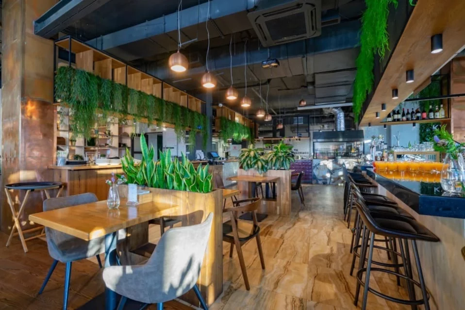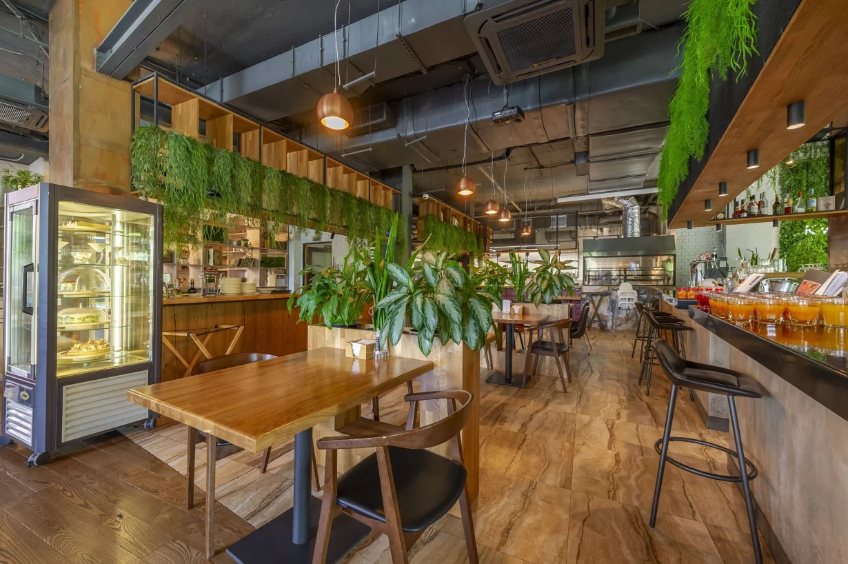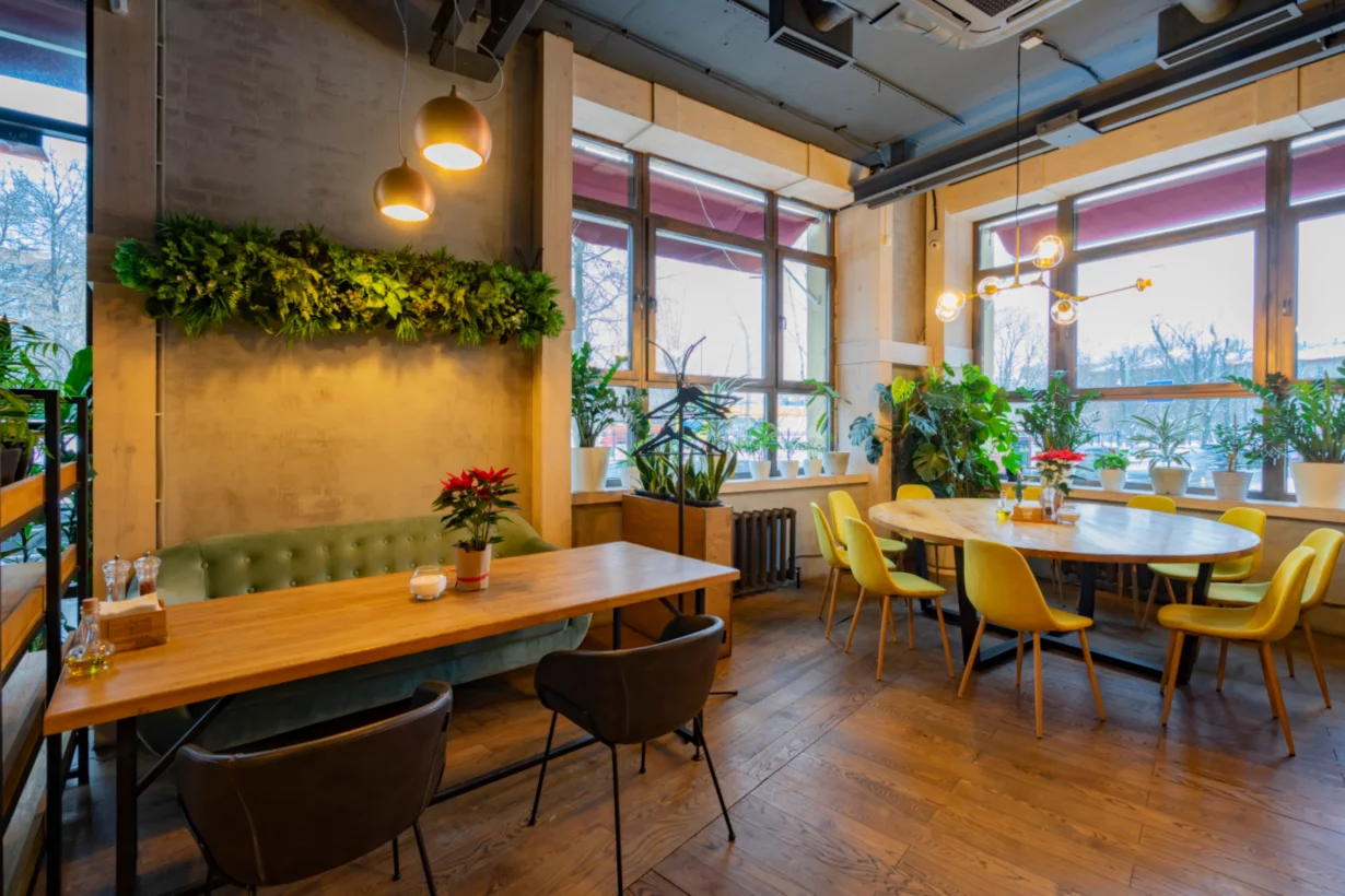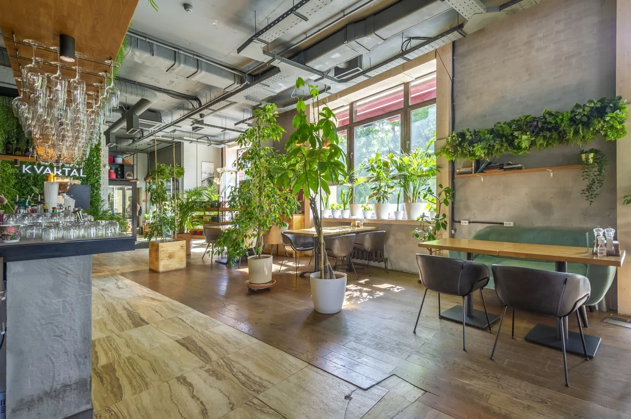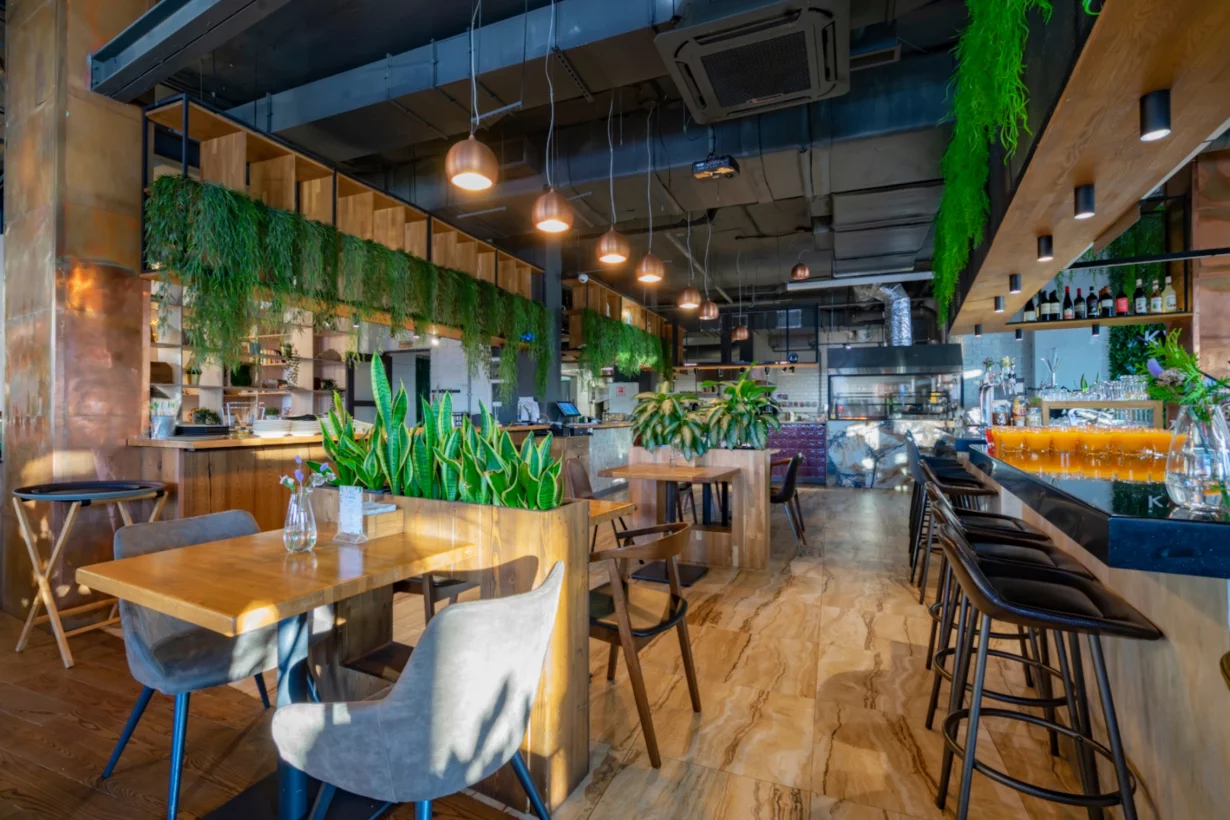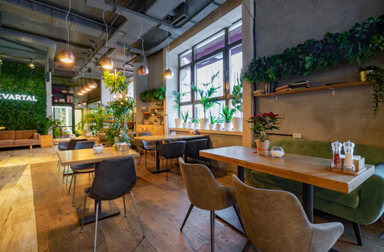 Ресторан с большим количеством зелени и разнообразным меню в ЖК «Маршал». Под Kvartal Green Garden выбрали вместительное пространство с панорамными окнами и открытой кухней.