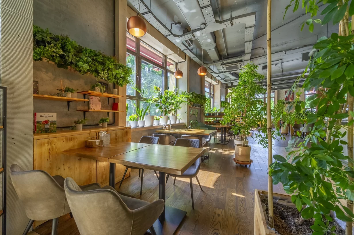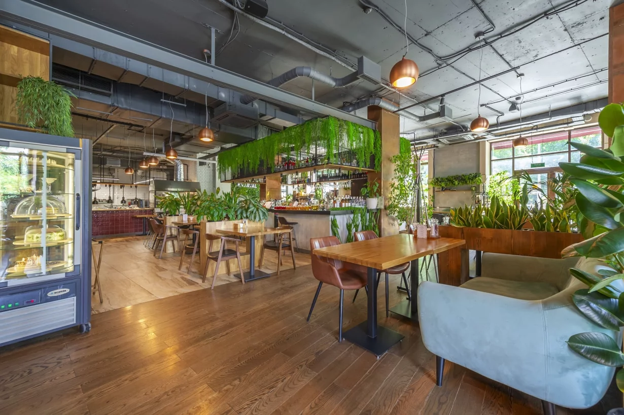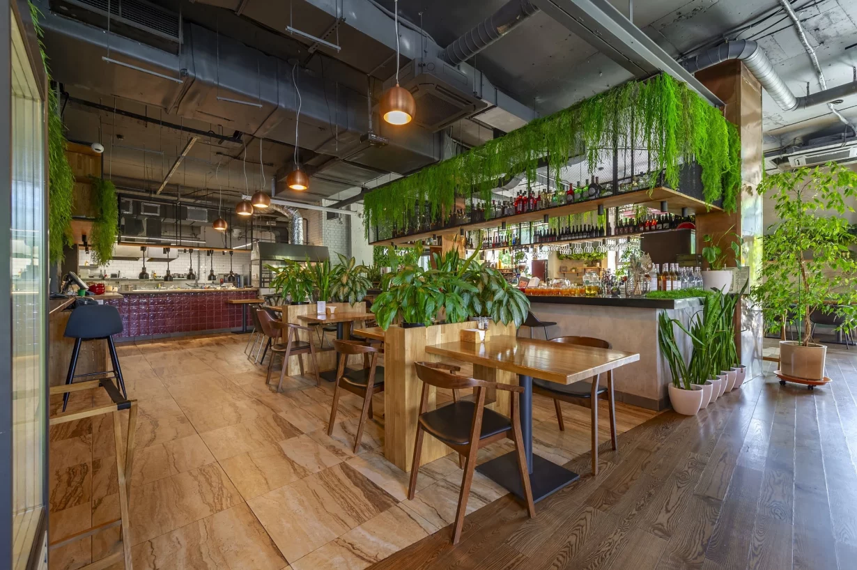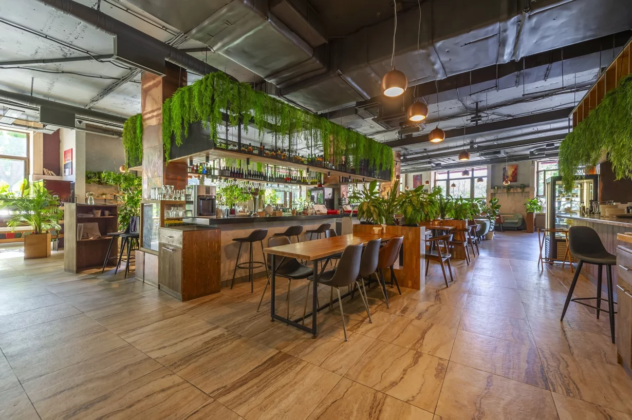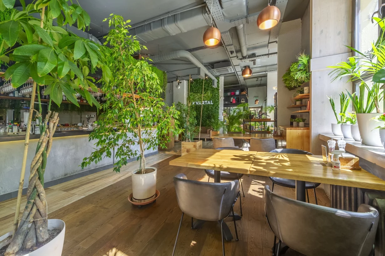 Ресторан с большим количеством зелени и разнообразным меню в ЖК «Маршал». Под Kvartal Green Garden выбрали вместительное пространство с панорамными окнами и открытой кухней.