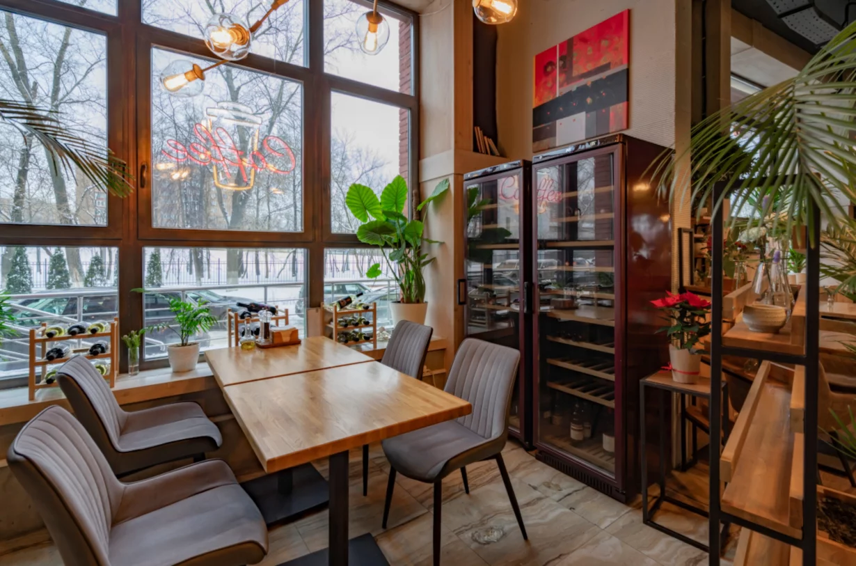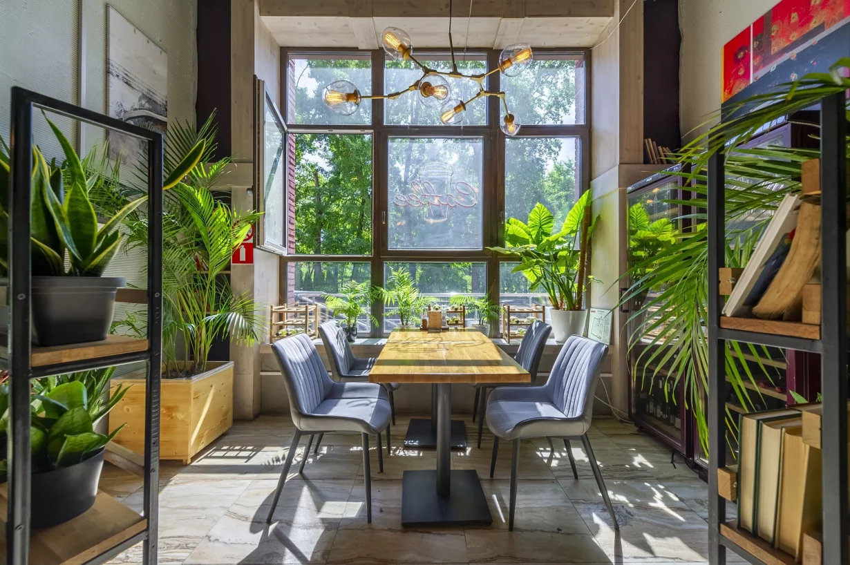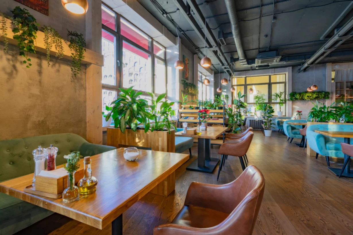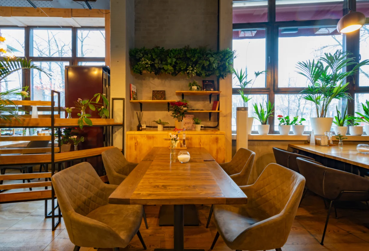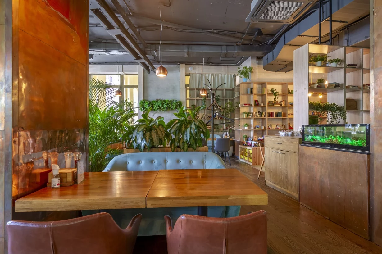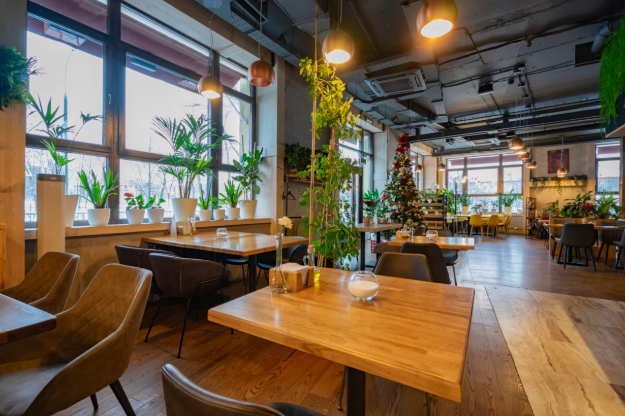 Ресторан с большим количеством зелени и разнообразным меню в ЖК «Маршал». Под Kvartal Green Garden выбрали вместительное пространство с панорамными окнами и открытой кухней.