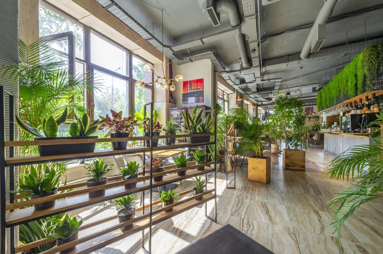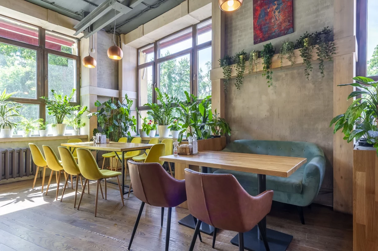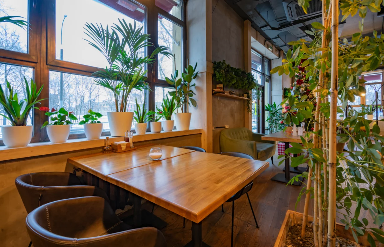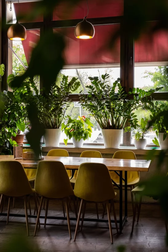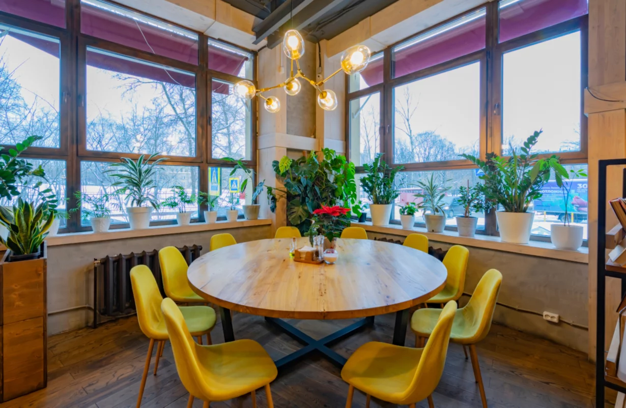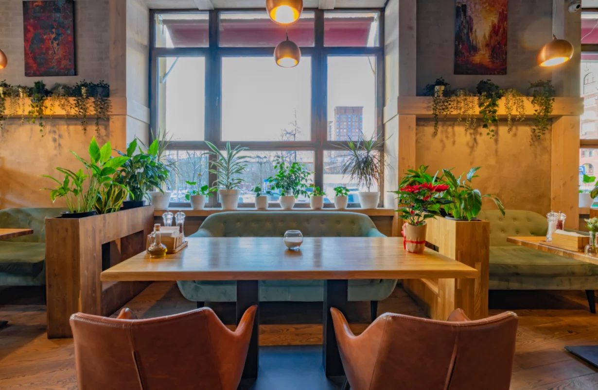 Ресторан с большим количеством зелени и разнообразным меню в ЖК «Маршал». Под Kvartal Green Garden выбрали вместительное пространство с панорамными окнами и открытой кухней.
