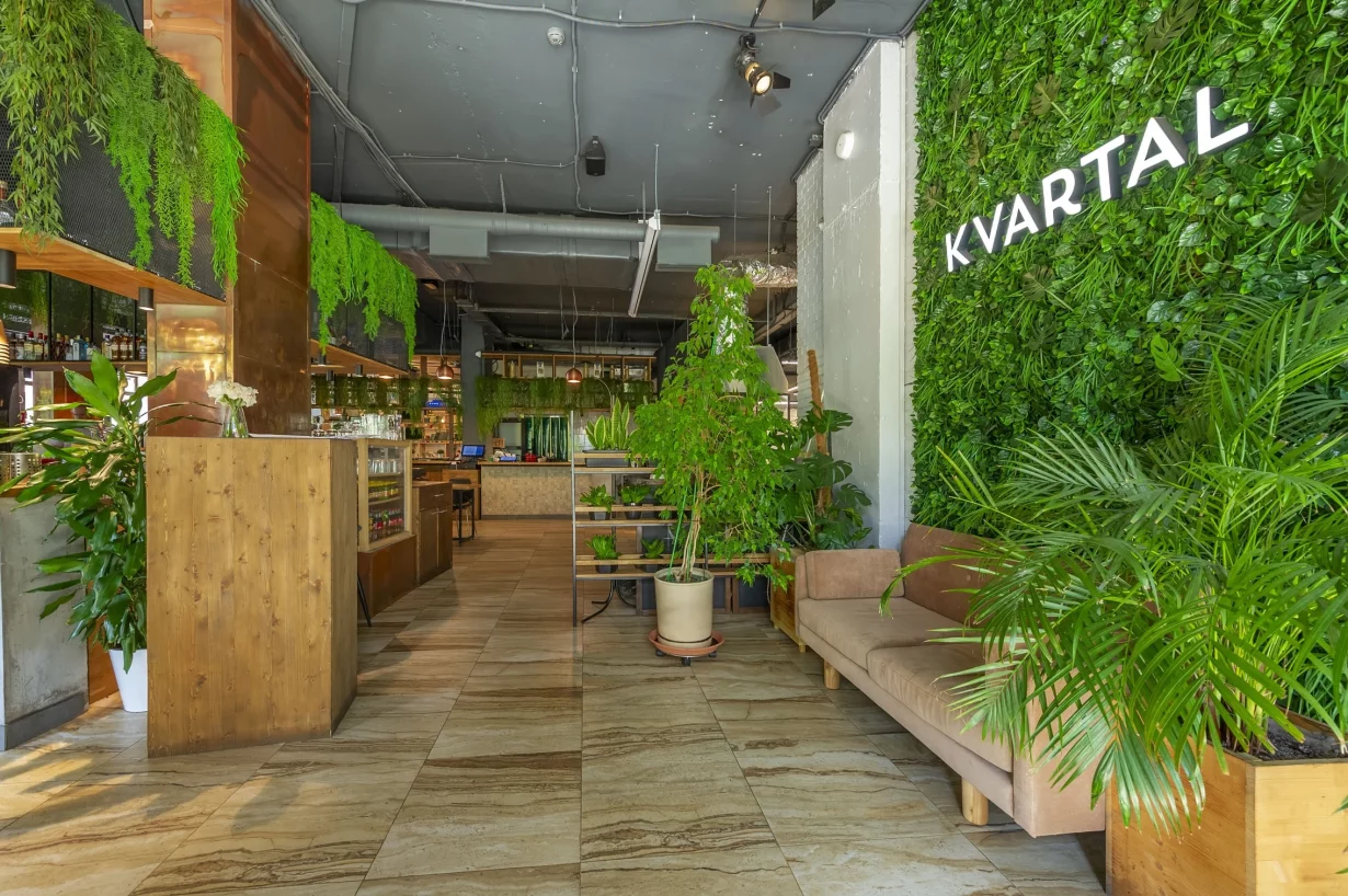 Kvartal Green Garden — стильный ресторан в районе Щукино города Москвы. Современный дизайн с озеленением 50% площади ресторана, авторское меню от шеф-повара, уникальная барная карта и высокий уровень сервиса.