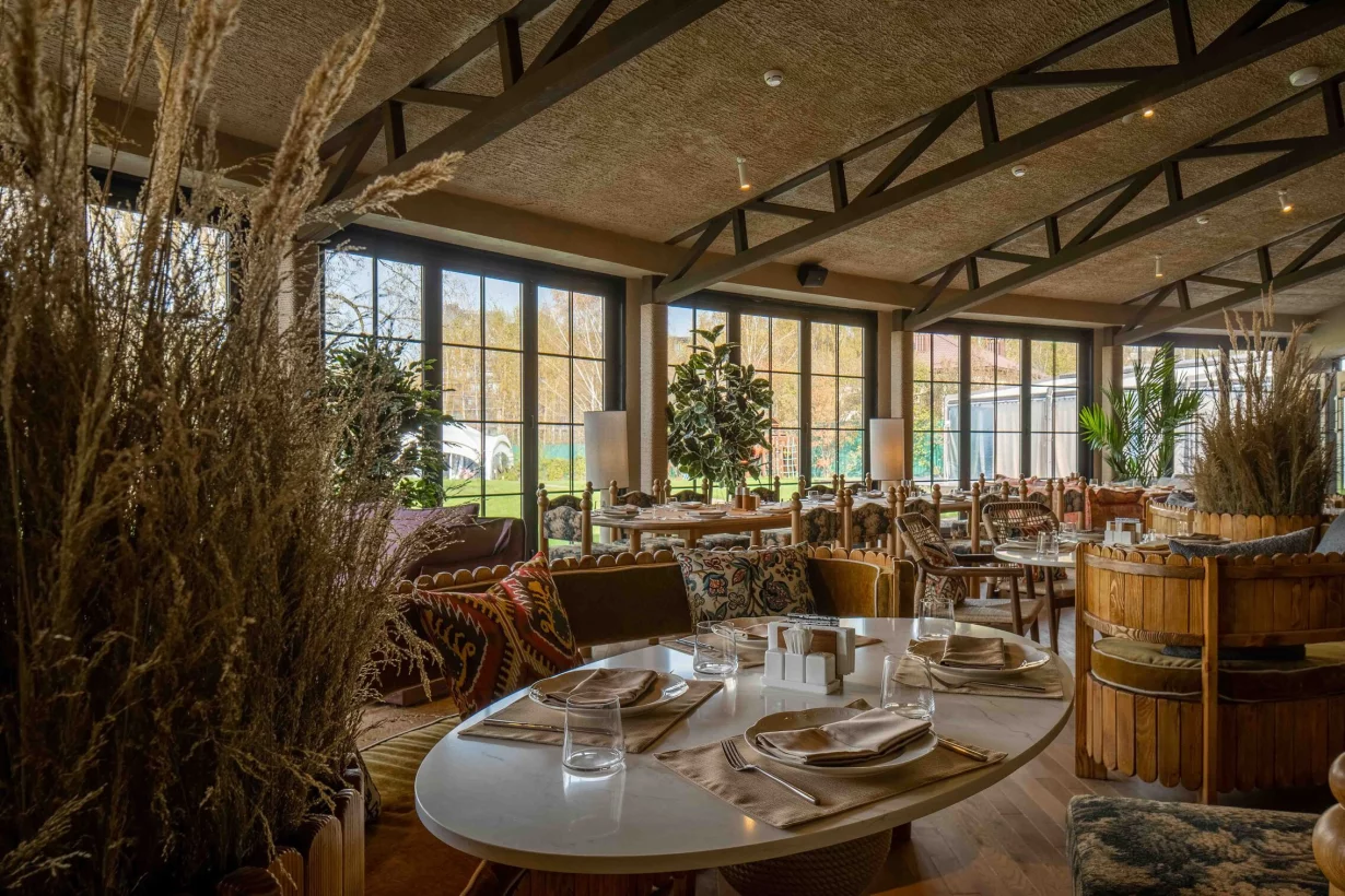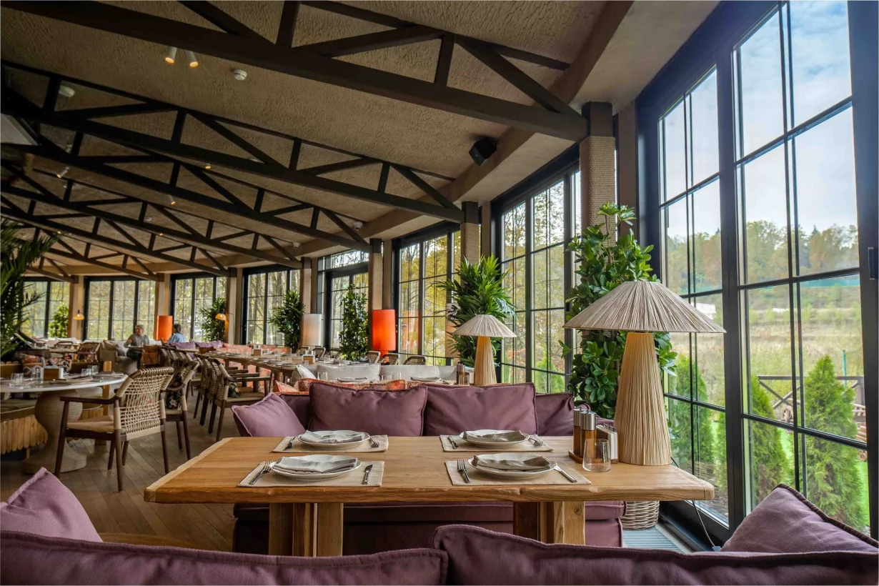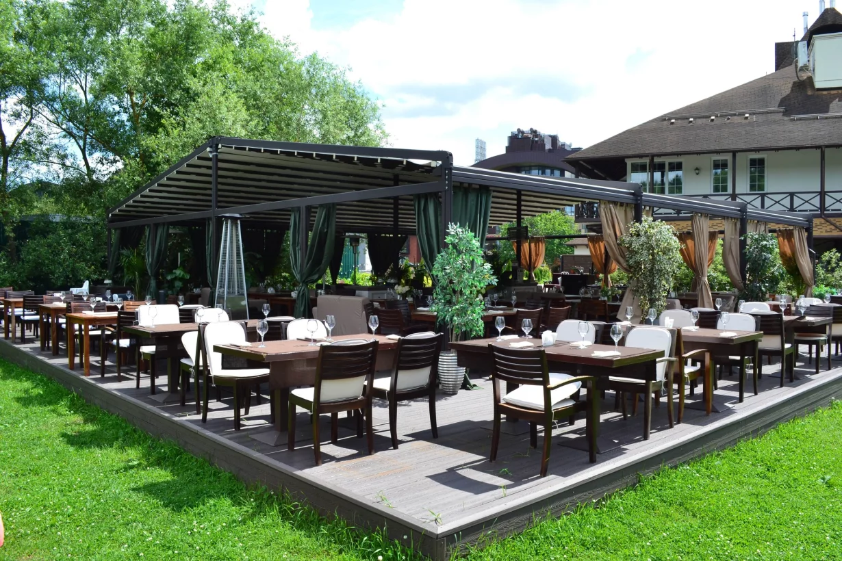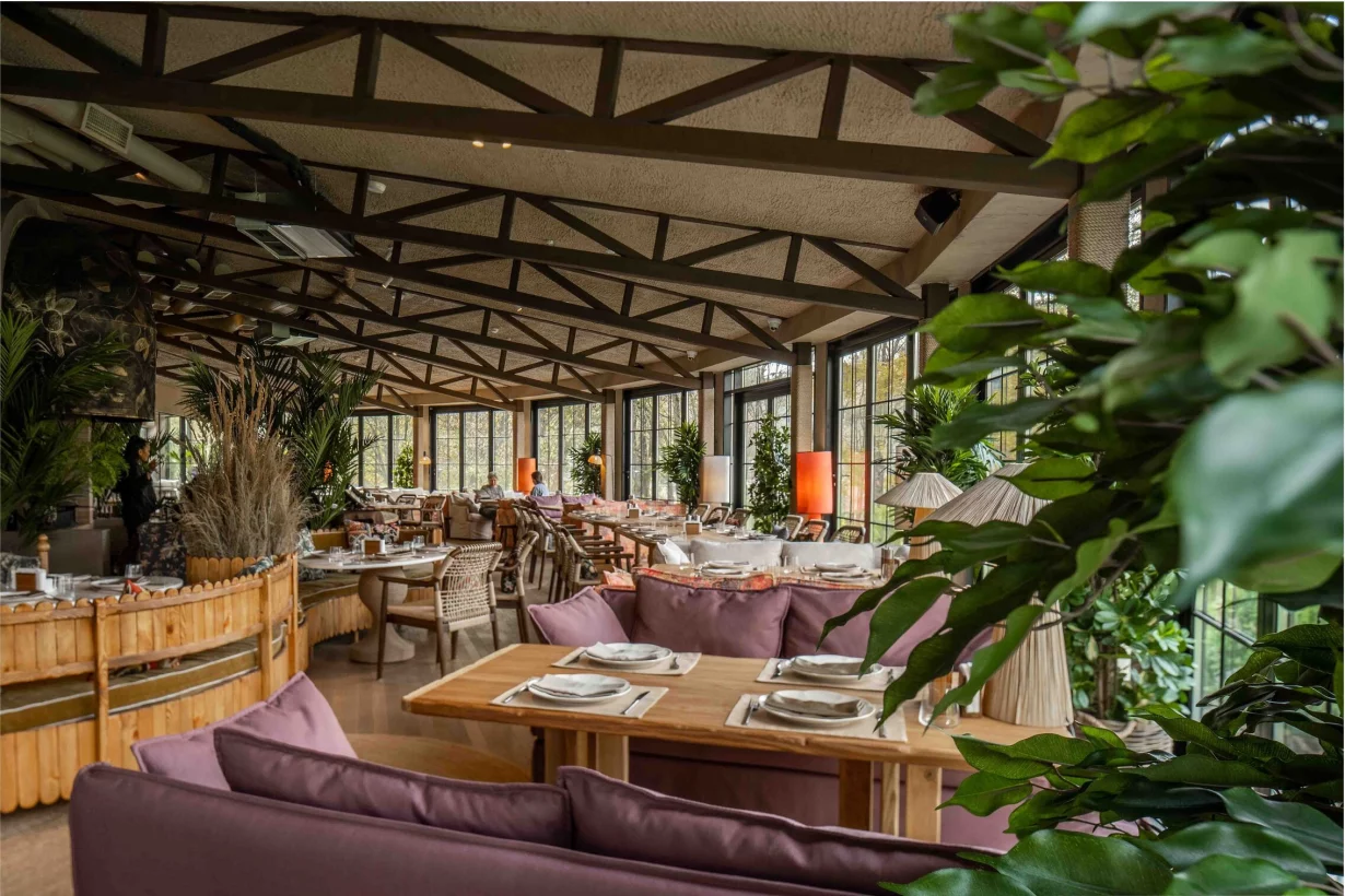 Ресторан органично вписывается в природный ландшафт, представляя собой пасторальный дом в лучших швейцарских традициях. Летом у нас работает живописная терраса на 120 гостей с панорамными видами на зелёные окрестности. Есть детская зона с батутами и качелями, проектор для просмотра мультфильмов и спортивных передач. Вечером становится особенно уютно: зажигается подсветка на деревьях и светильники по периметру.
