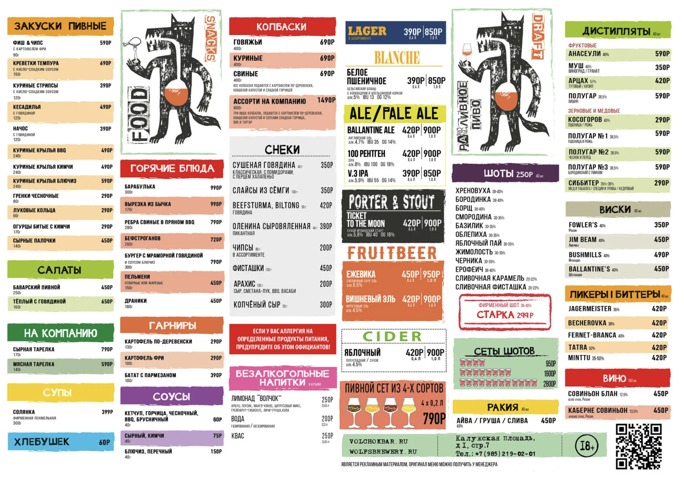 Разливают эль и лагер, подают сидры и пивные сеты из нескольких сортов. Перекусить предлагают закусками в европейском и латиноамериканском стиле: готовят фиш энд чипс, начос и сырные палочки. Среди более сытных блюд — солянка, пельмени, бургеры и колбаски.