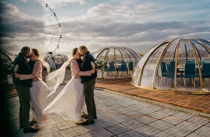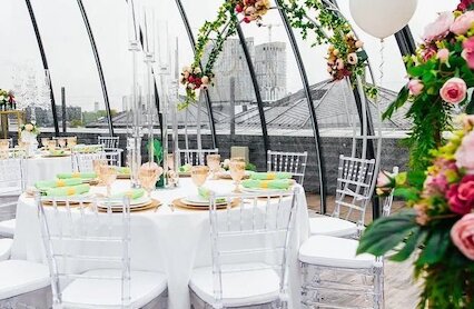 - Прозрачные купольные беседки на крыше с видом на город, которые работают круглый год