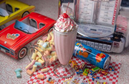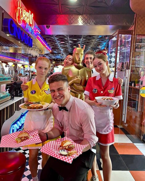 - Америка 50-х, каноничные бургеры с милкшейками и столик-кабриолет из «Криминального чтива»