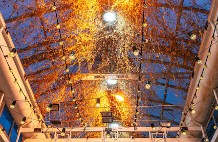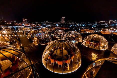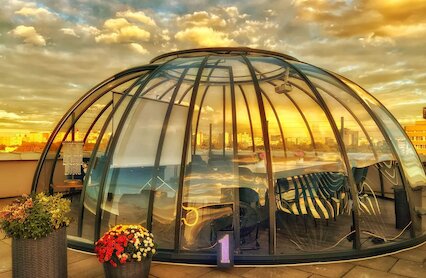 - Прозрачные купольные беседки на крыше с видом на город, которые работают круглый год