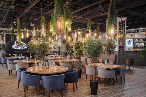 В торговом центре представлены различные рестораны и кафе, предлагающие кухни мира, включая итальянскую, японскую и русскую.