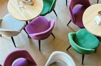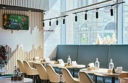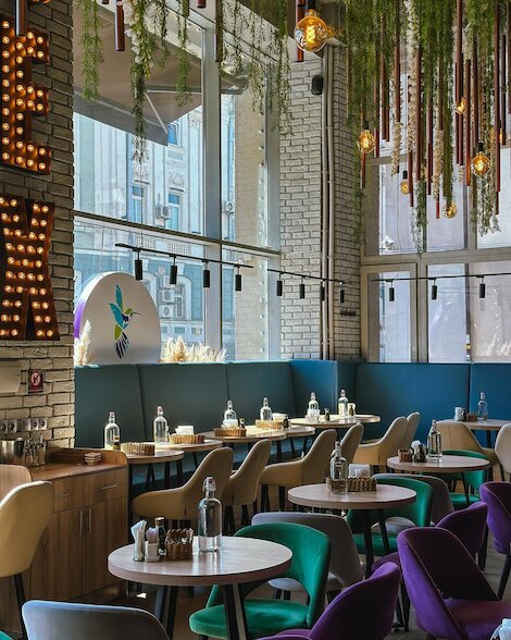 - Модерновый интерьер и полноценная кухня в яркой кофейне на проспекте Сахарова