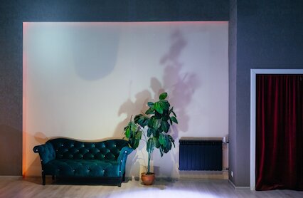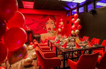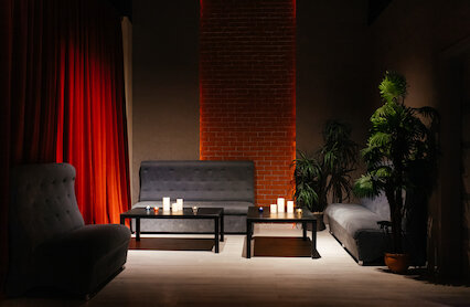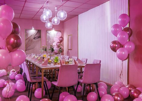 - Лофт в районе ВДНХ, один из залов которого полностью обшит розовым плюшем