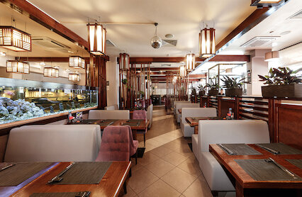 - Лаконично-стильный японский ресторан с большими порциями суши и роллов