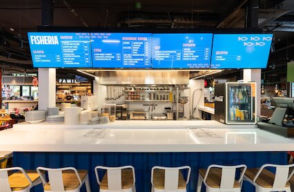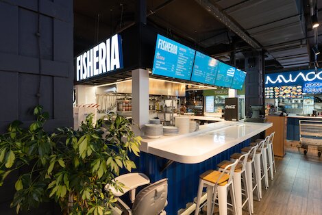 - Корнер с блюдами из морепродуктов на фуд-корте «Зеленый рынок» в ТЦ «Беляево»