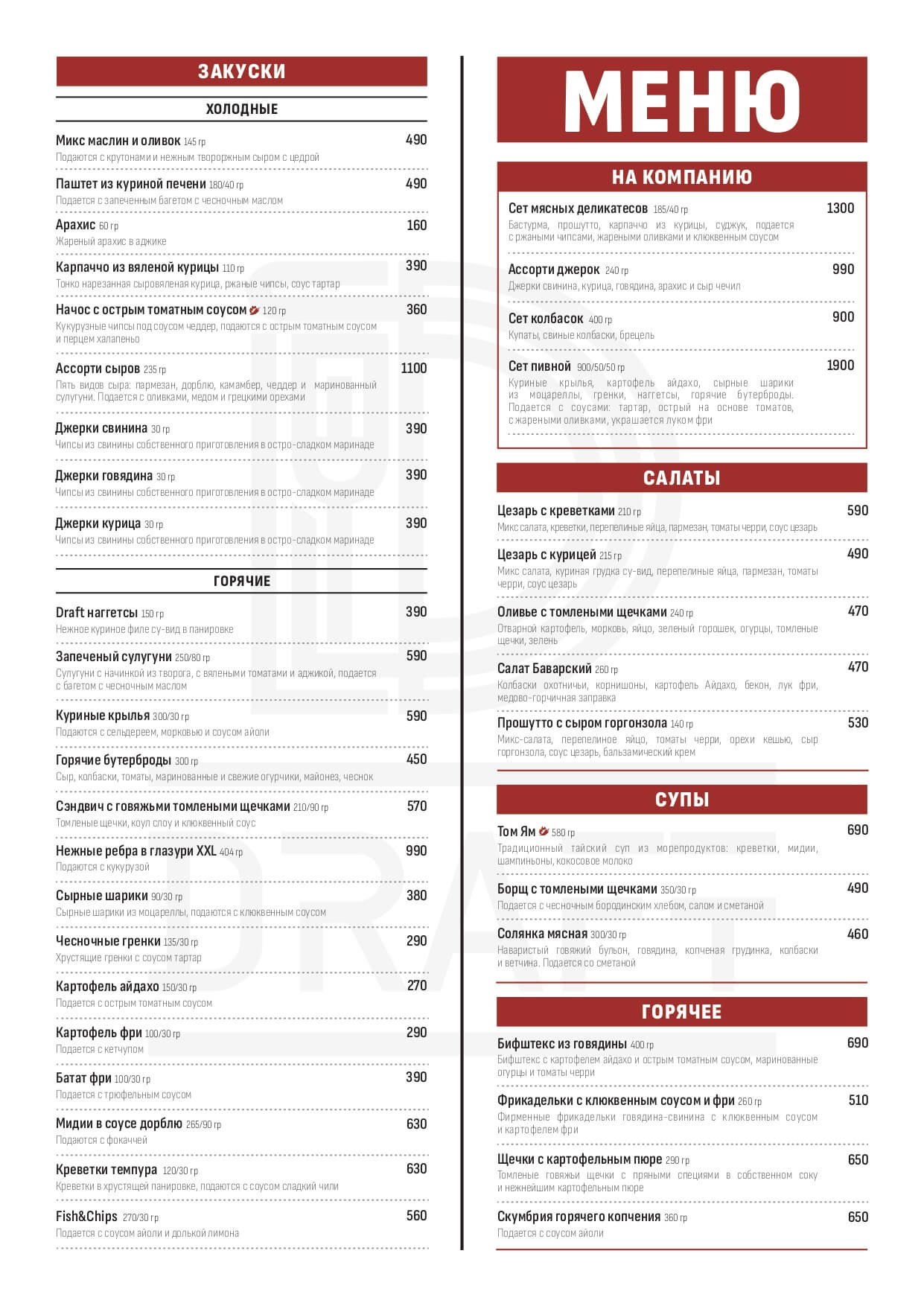 В основе меню — мясные блюда и все, что «идет» к пиву: джерки, креветки темпура и ассорти колбасок. Посытнее — скумбрия горячего копчения, говяжьи щечки и бифштекс.