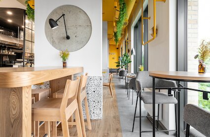 - Стильная кофейня с геометричной деревянной отделкой и завтраками