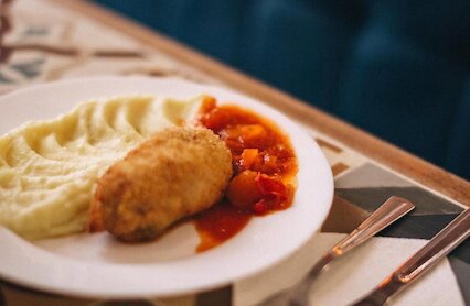 - Столовая с домашней кухней и жизнерадостным интерьером