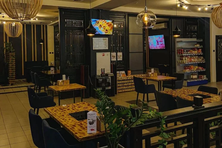 Светлый интерьер, зал на 65 человек и отдельная комната с диваном, плазмой и мини-гольфом — вот он, корейский дом вне дома. Порции рассчитаны сразу на несколько человек, а уровень остроты регулируют по вашему желанию. На столах — специальные плиты для самостоятельного приготовления.