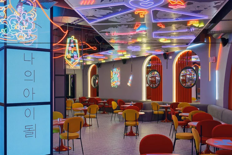 Неон, яркая мебель, k-pop на фоне и собственный мерч — это заведение сделано фанатами для фанатов. В меню — решили сосредоточиться на вау-эффектах и не прогадали. Готовят:
