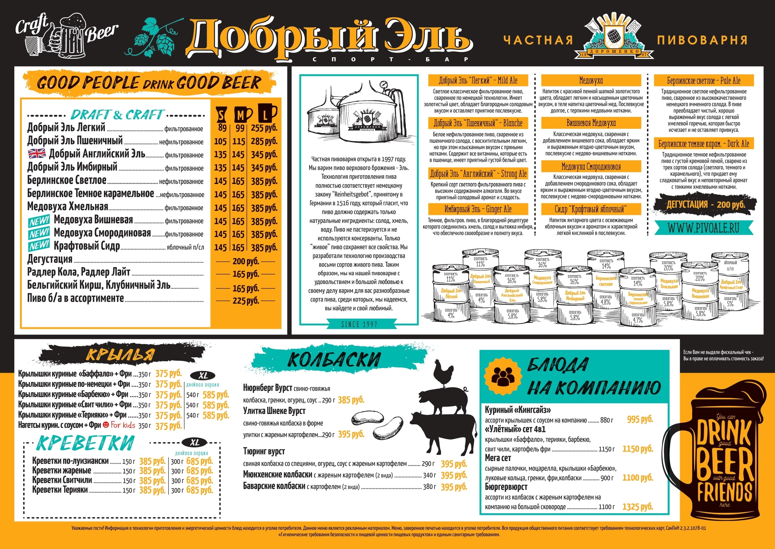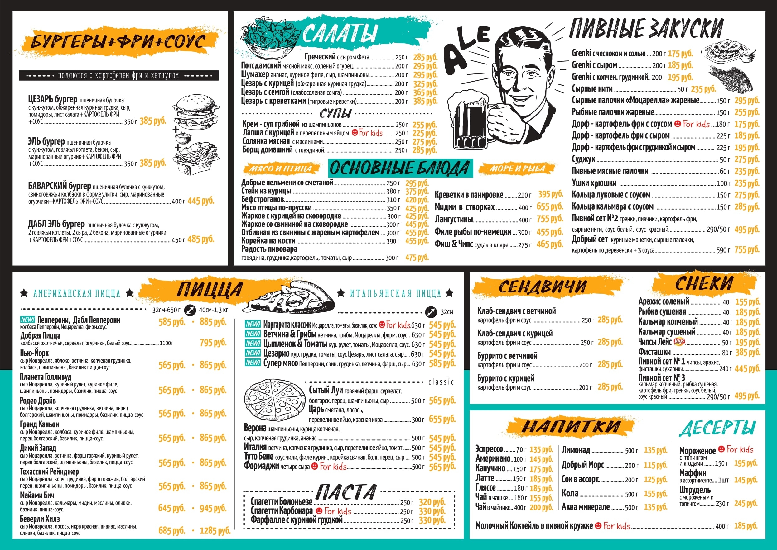 В меню представлена европейская кухня: для начала подают салат цезарь, пивные закуски и комбо из бургера и картофеля фри. В горячем меню — пицца, паста и супы, а в барной карте представлено пиво из собственной пивоварни.
