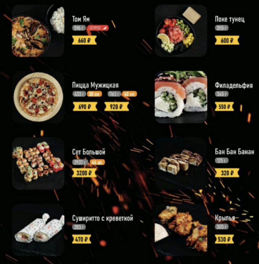 В меню представлены популярные блюда разных кухонь мира с акцентом на Азию: начать предлагают с поке или рыбных роллов, на горячее подают том-ям и пиццу, а на сладкое — роллы с бананом.