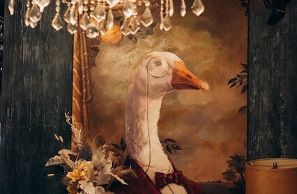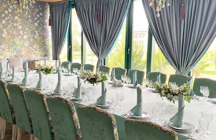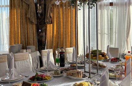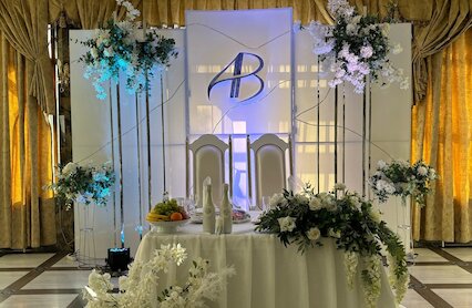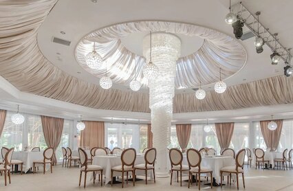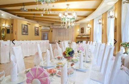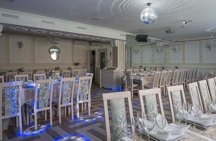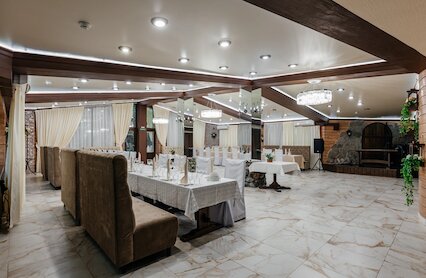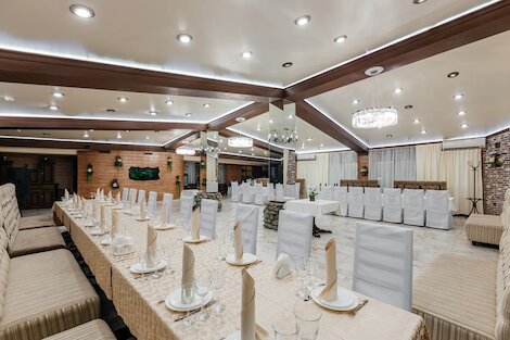 - Банкетный зал c торжественным интерьером на территории отеля «Легенда» на проспекте 40-летия Победы