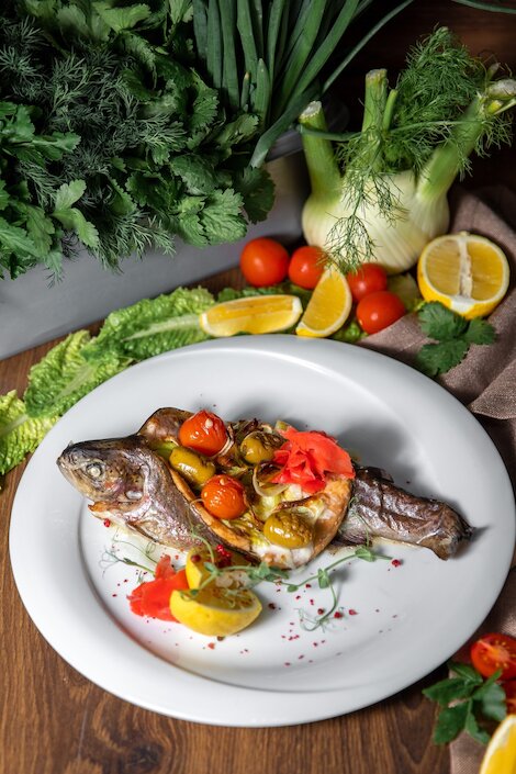 - Живописный рыбный ресторан на горной реке с фермерской форелью на углях