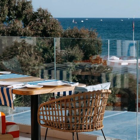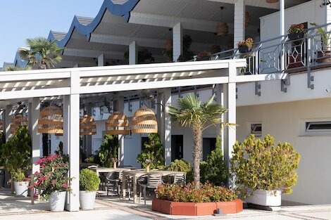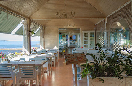 - Средиземноморский ресторан с летней верандой и панорамным видом на частном пляже отеля Odisseya Wellness Resort.