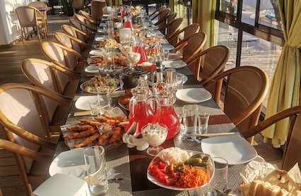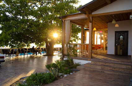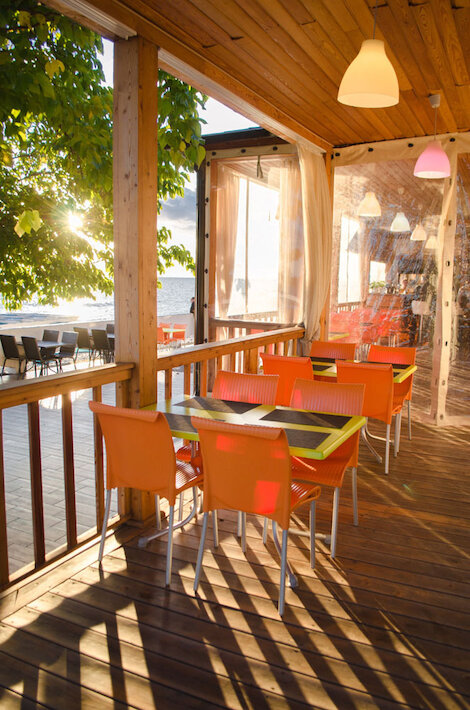 - Рыбный ресторан с открытой верандой и видом на набережную в курортном поселке Якорная Щель.