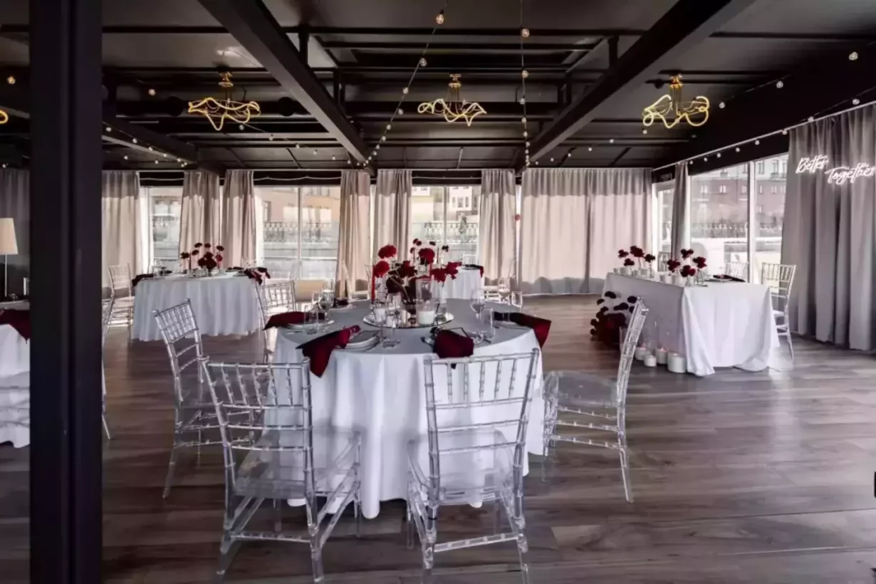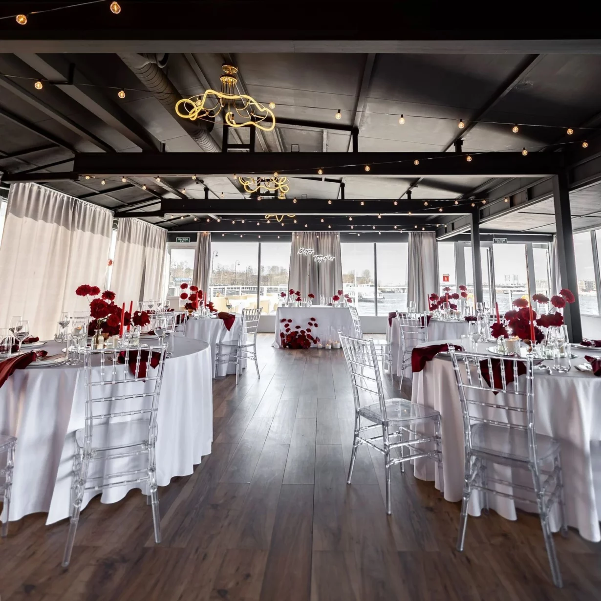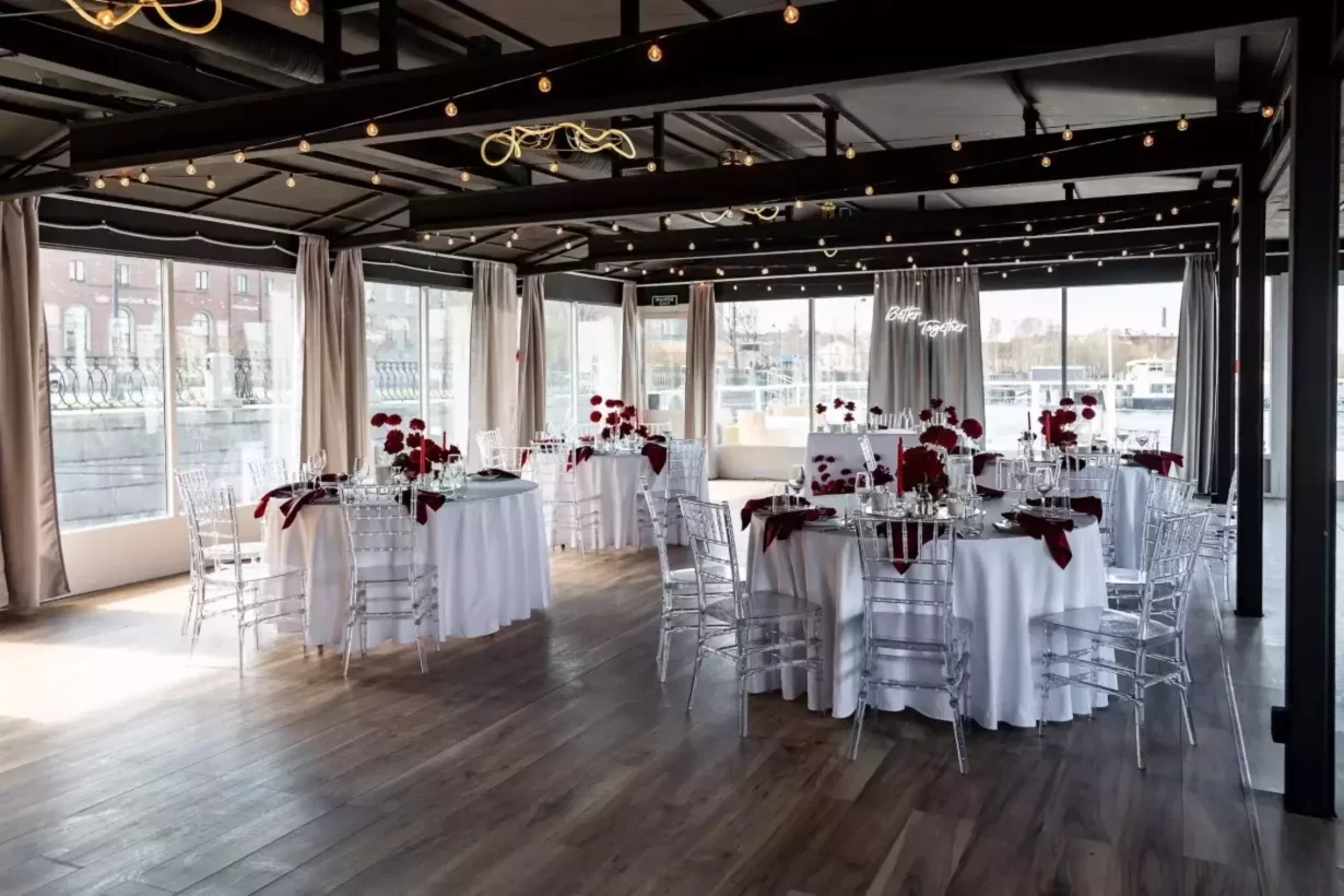 Команда «Акварели» поможет с организацией мероприятия любого формата. Корабль пришвартуется бесплатно, пробковый сбор на свой алкоголь отсутствует, именинника поздравят десертом. За первые 6 часов не берут плату за аренду. Меню банкетного зала составили из блюд европейской и русской кухни.Летом в ресторане открыта терраса у воды.