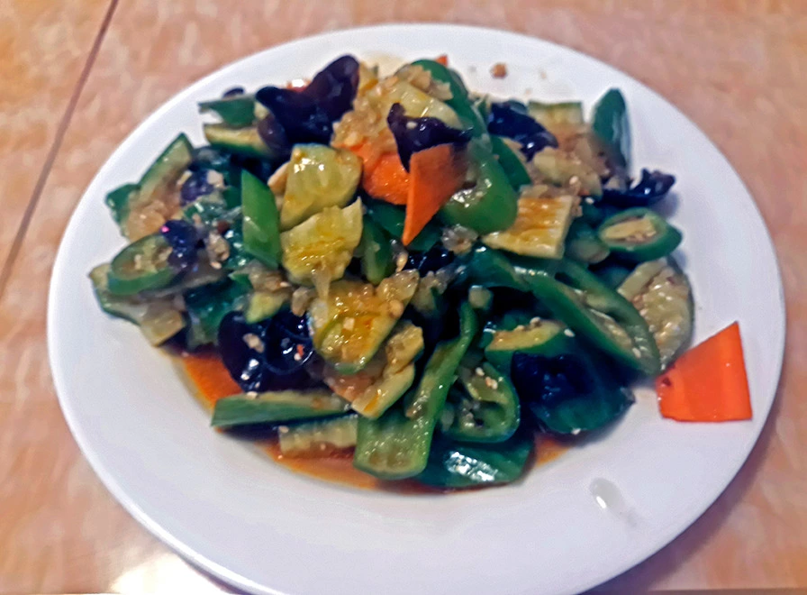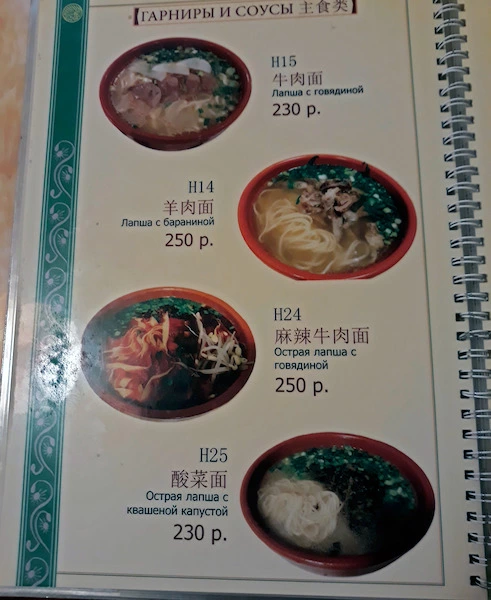 Меню небольшое, закусок около десятка стандартных. Также 10-20 горячих блюд из говядины, баранины и курицы. Свинины нет. Это не просто китайское кафе, а мусульманское к тому же. Рыбы тоже почему-то нет. Зато нашлись баклажаны, вешенки в кляре, лапша с овощами - вегетарианец не уйдет голодным. Встретилось пара необычных блюд: какие-то странные яйца, пирожки с черемшой.