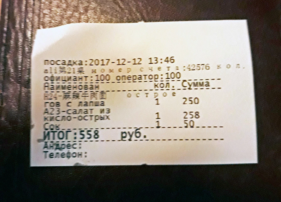 Обслуживание, кстати, очень бодрое. Официантов несколько, все мужчины, только не китайцы, на среднеазиатов похожи. Видимо, это дань концепции. Принимают заказ и приносят все быстро. Понятно, ведь все кафе было полностью забито людьми. Они заинтересованы, чтобы гости быстрее получили заказ, поели и освободили место следующим.
