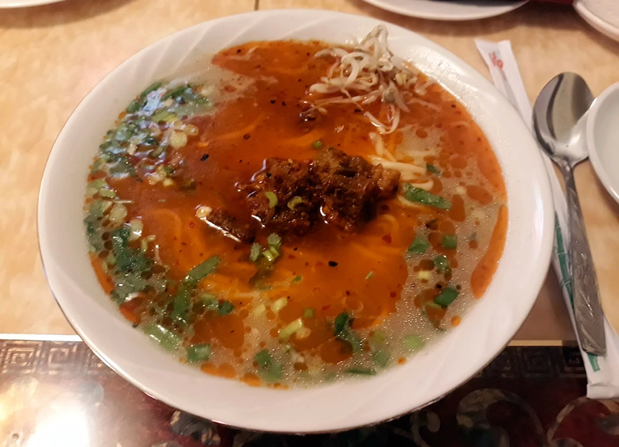 Острую лапшу в бульоне люблю горячо, ее и взяла. Порцайка в меню казалась небольшой, грамм 300 на вид. Подумала, что свежая овощная закуска будет в тему. В обычных китайских ресторанах таких блюд в изобилии, но здесь были только огурцы. Принесли одновременно и быстро. Даа. С размерами я ошиблась раза в три. Лапши таз, а овощи - это большая такая столовая тарелка, покрытая с горкой. Остальные блюда, которые проносили мимо, выглядели такими же гигантскими. Особенно курица с картошкой и лапшой. Там еды килограмма на два!