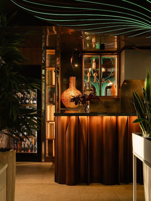 Огромные окна ресторана открывают вид на залив и лес. Узкие колонны, поддерживающие потолок, стилизованы под деревья. Живая зелень в узких высоких кадках создаёт ощущение продолжения леса на территории ресторана.