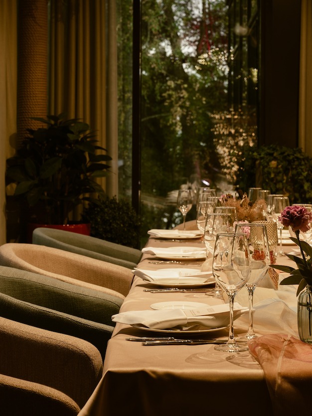 Зал ресторана просторный, неконтактная стойка располагается в глубине. В ресторане есть группы с угловыми диванами, рассчитанные на большую компанию, а также диваны и столы поменьше — для семьи или пары. Для коллег, друзей и небольшой компании близких предусмотрены круглые столы, окружённые креслами.