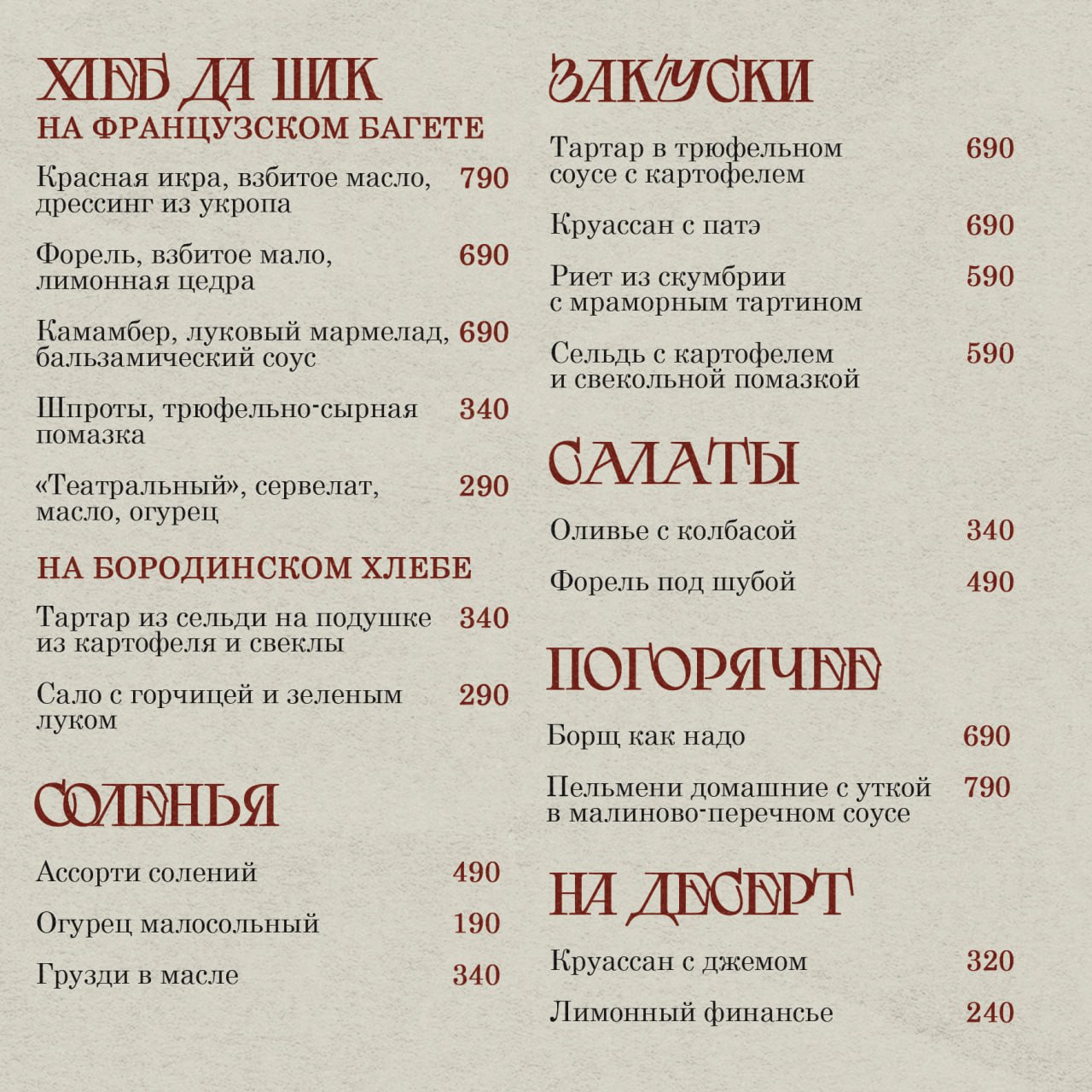 Кухня — авторская интерпретация русской классики. Здесь подают тартар из сельди на бородинском хлебе со свеклой, форель под шубой и пельмени с уткой. К напиткам — настойки ручной работы: банановая, смородиновая, перечная.