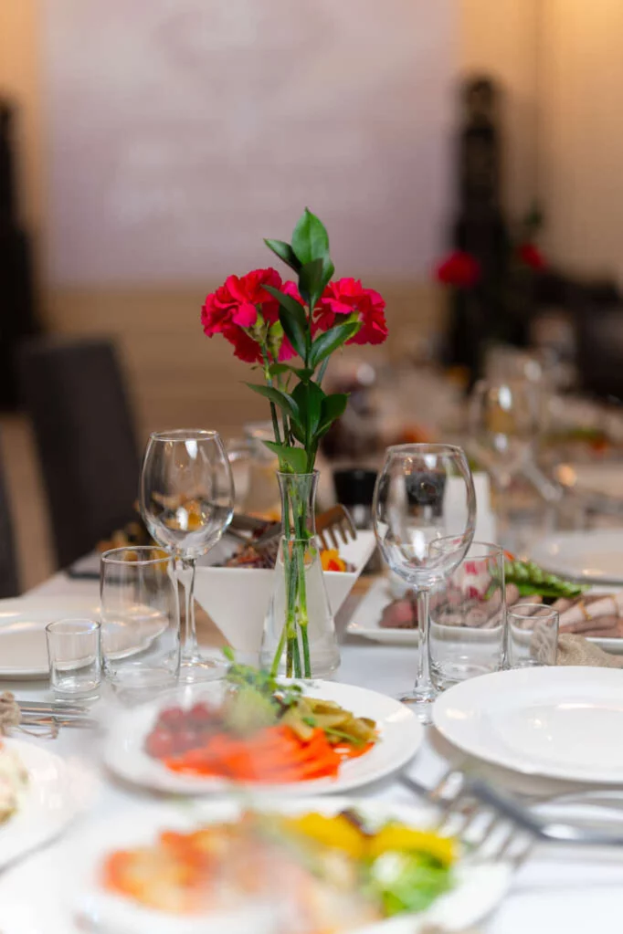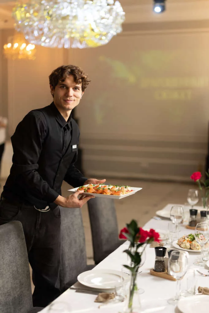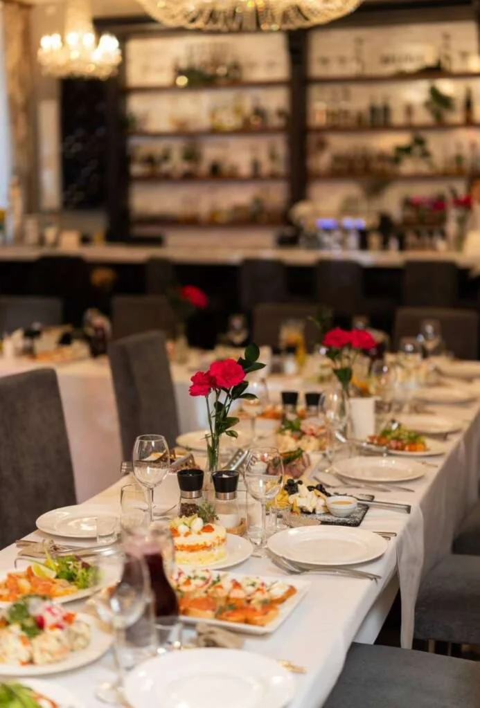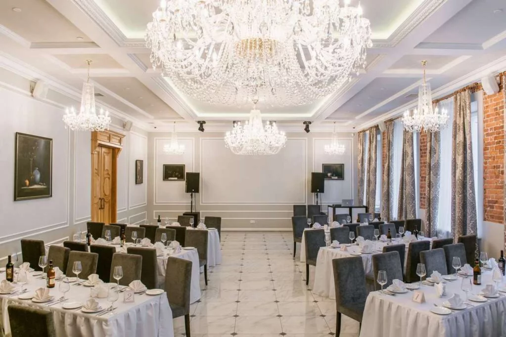 Внутри — элегантный светлый зал для особых событий. Здесь историческая архитектура встречается с современным звучанием: высокие потолки, огромные люстры, изысканная сервировка и атмосфера душевного уюта создают пространство, где всё складывается легко, элегантно и красиво.