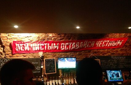 - Ироничный бар-рюмочная с тусовками и лозунгом «Пей чистым, оставайся честным»