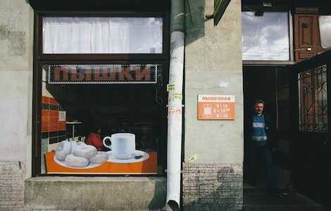 - Небольшая винтажная пекарня через дорогу от «Звенигородской» с продуктовой лавкой