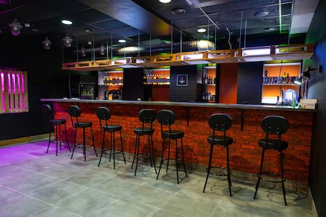 - Бар с бургерами, кикером и парикмахерским кабинетом