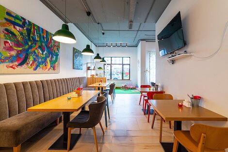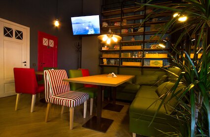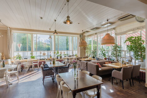 - Просторный семейный ресторан с атмосферой загородного дома, окруженного зеленью